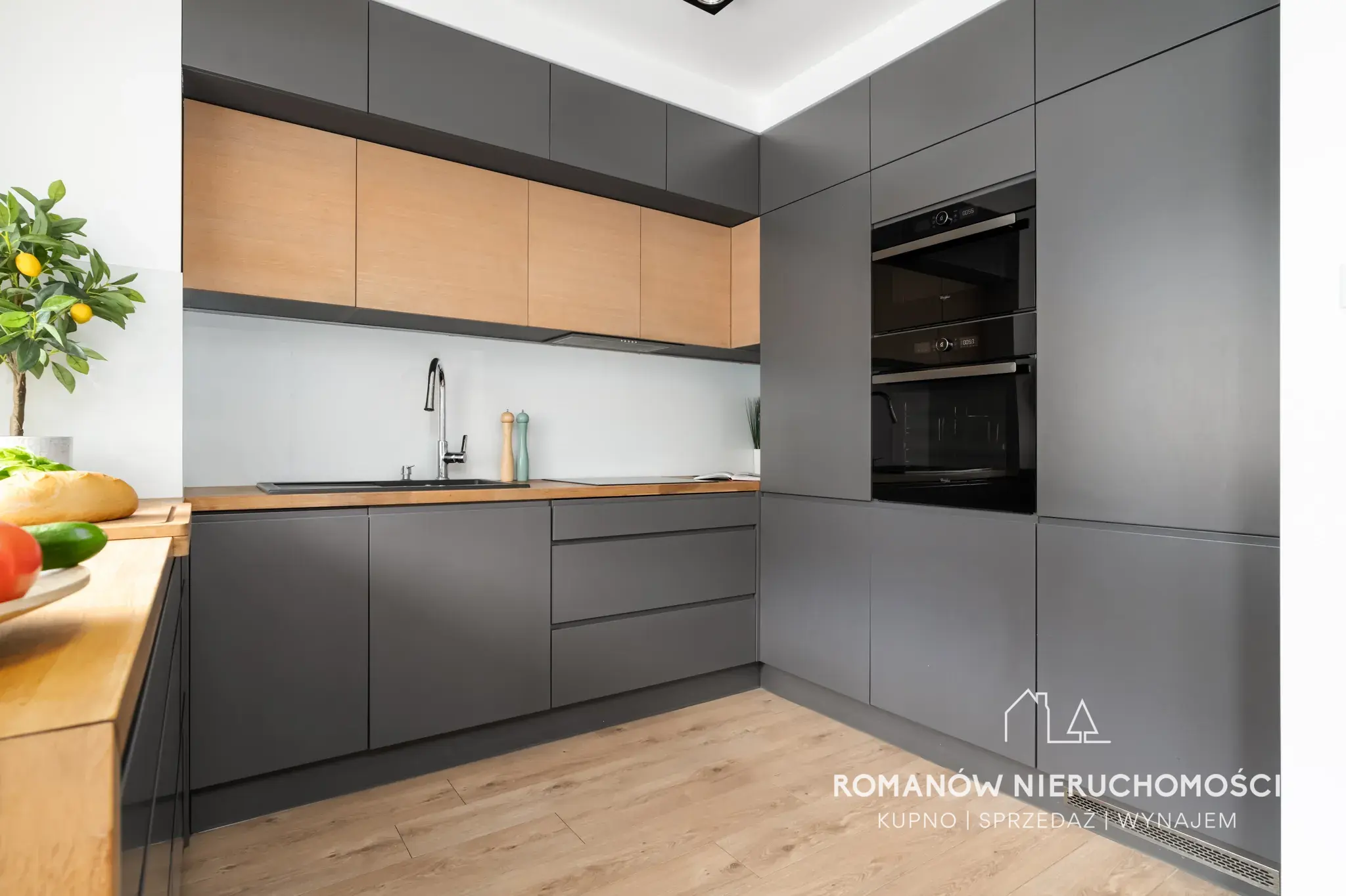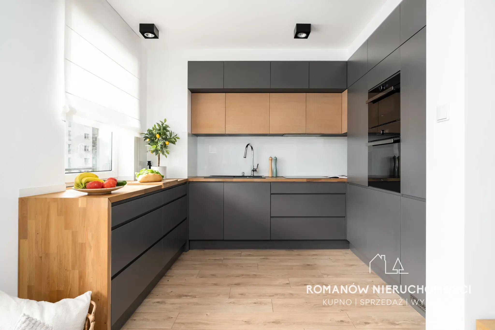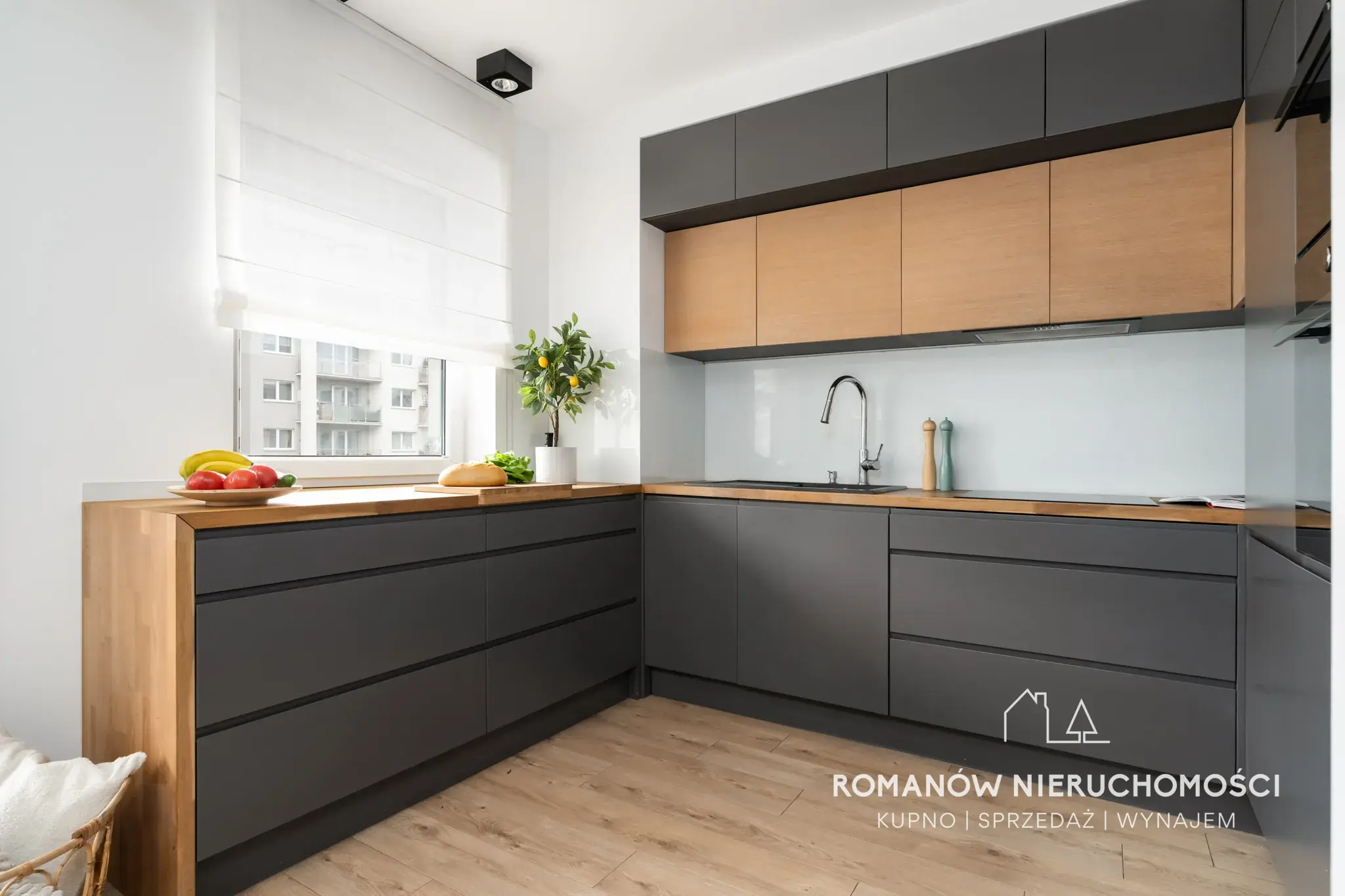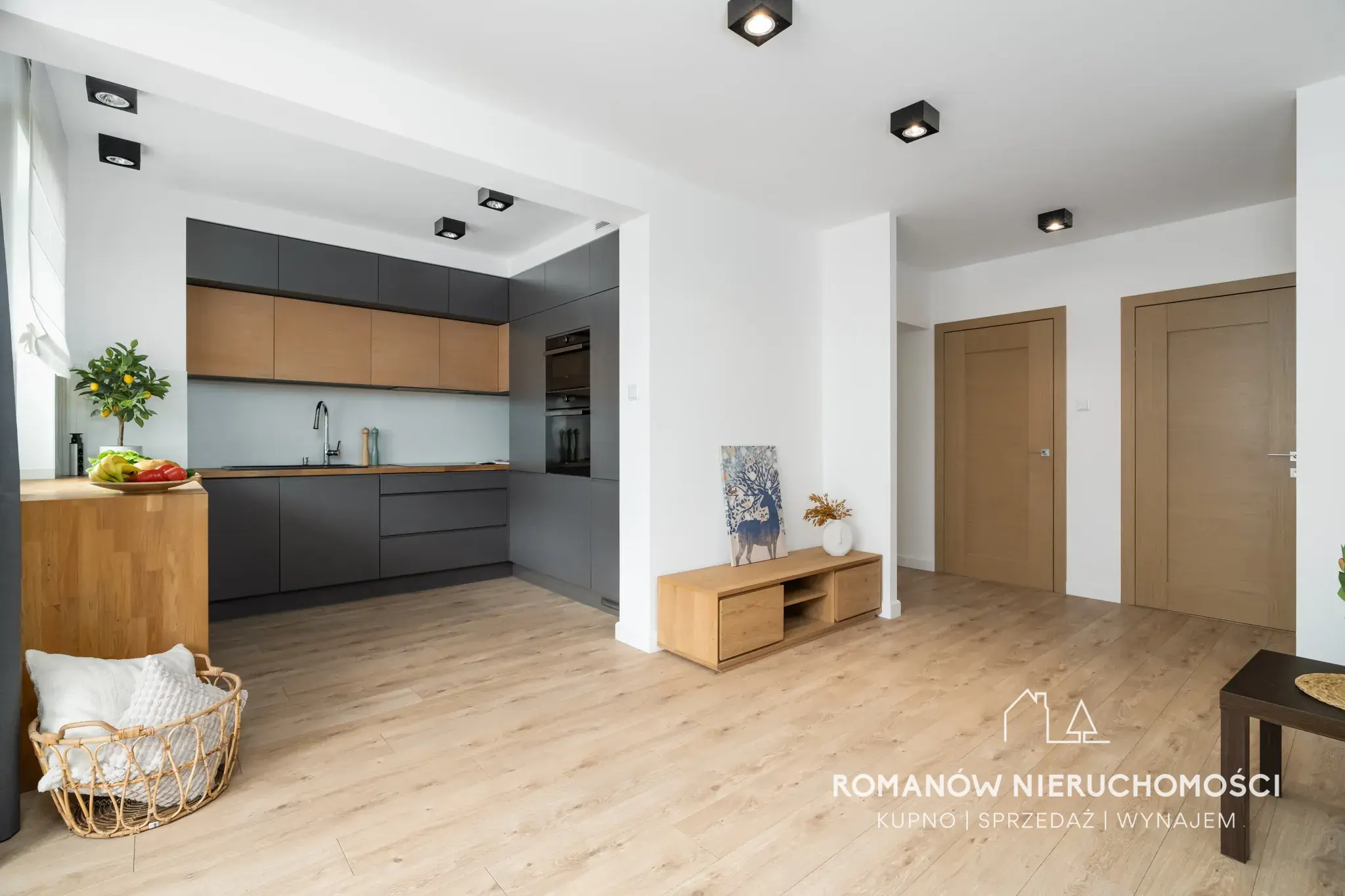 - salon z aneksem kuchennym 29,42 m² z wyjściem na balkon (kuchnia na wymiar w pełni wyposażona, na oknach żaluzje zaciemniające plus roleta rzymska na oknie w kuchni, podtynkowy tunel tv, stół, krzesła)