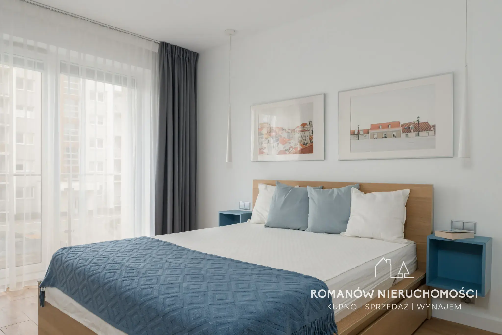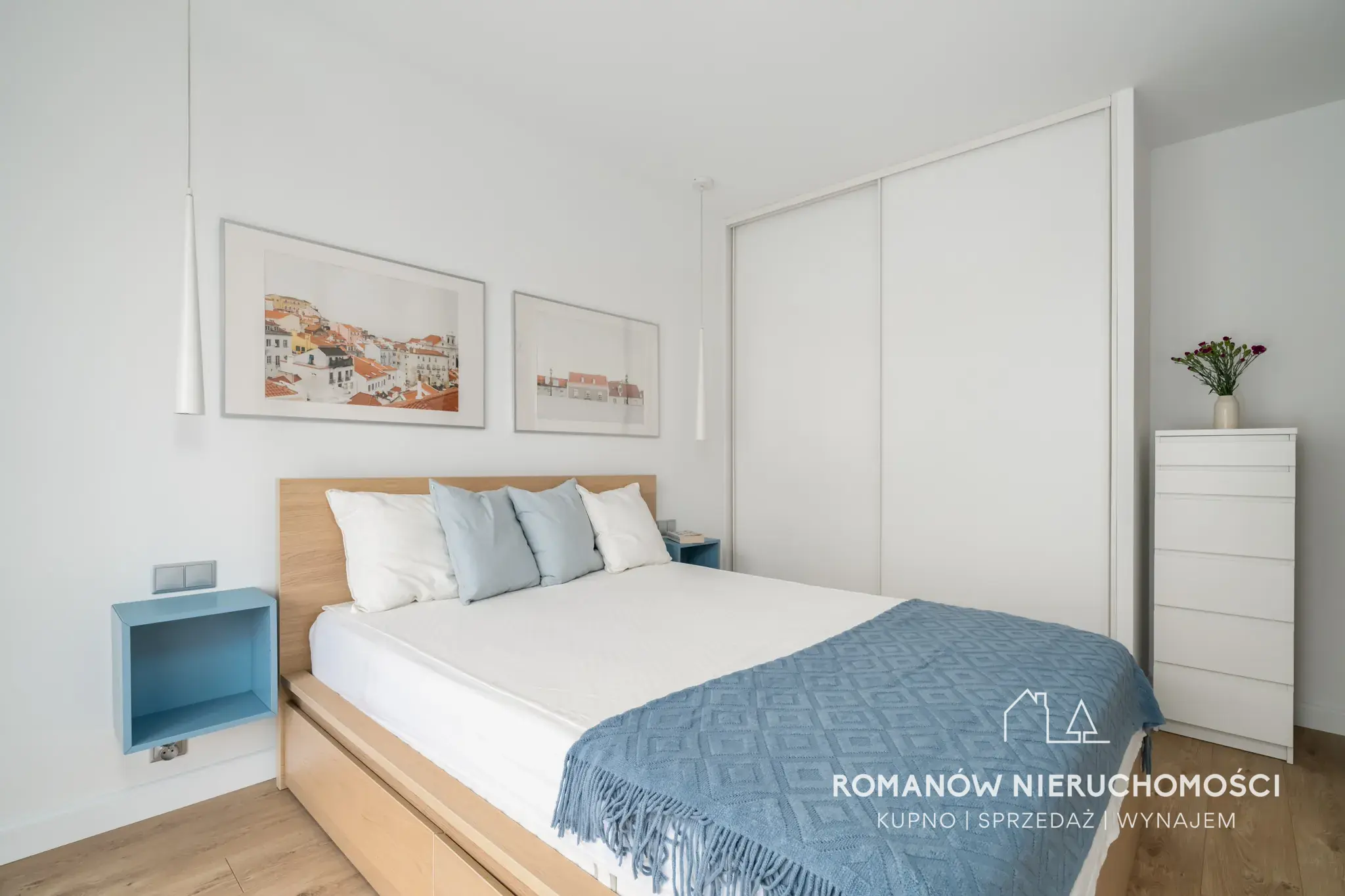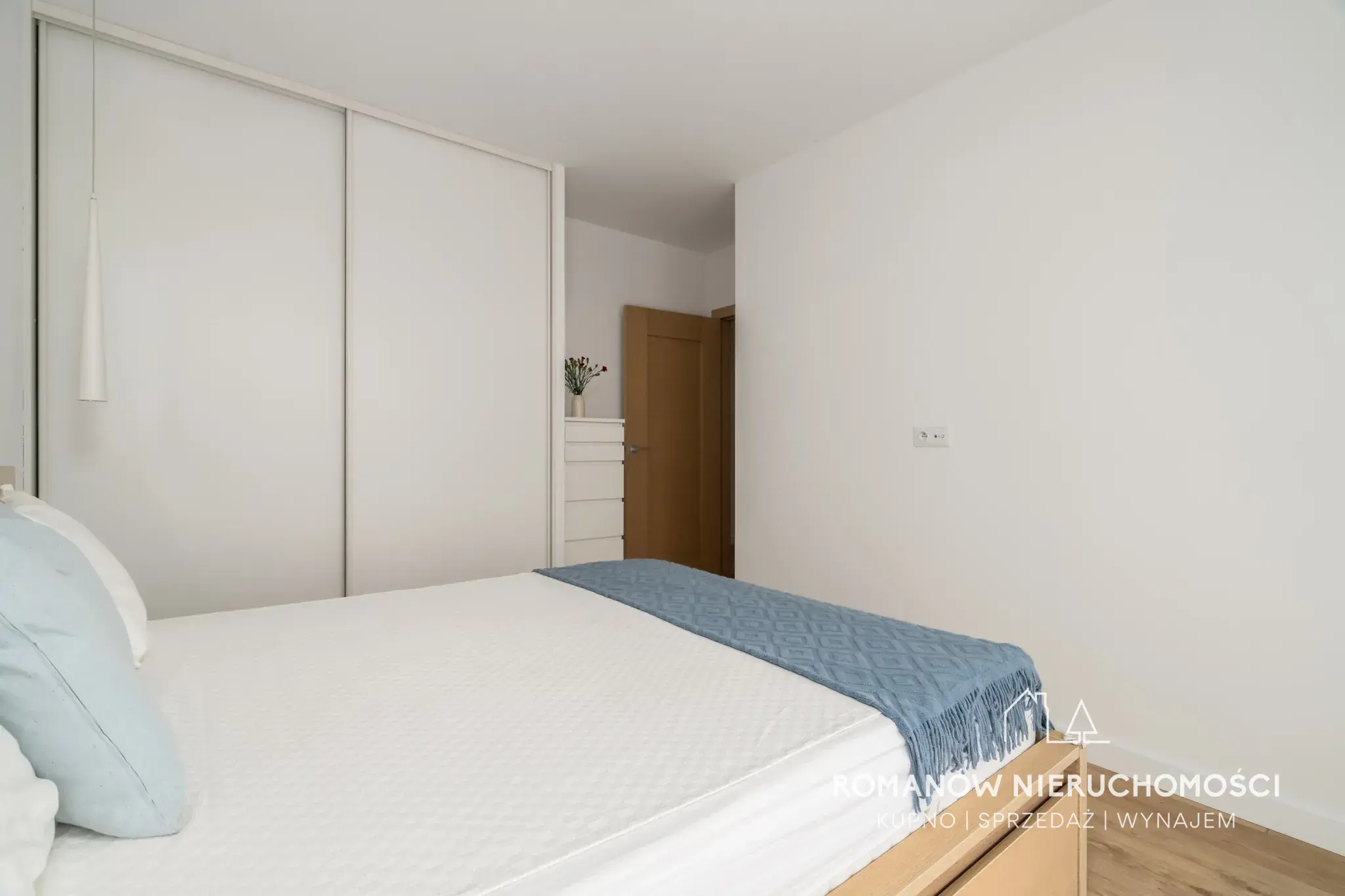 - sypialnia 13,48 m² z wyjściem na balkon (żaluzje zaciemniające, szafa w zabudowie, komoda, łóżko z szufladami)