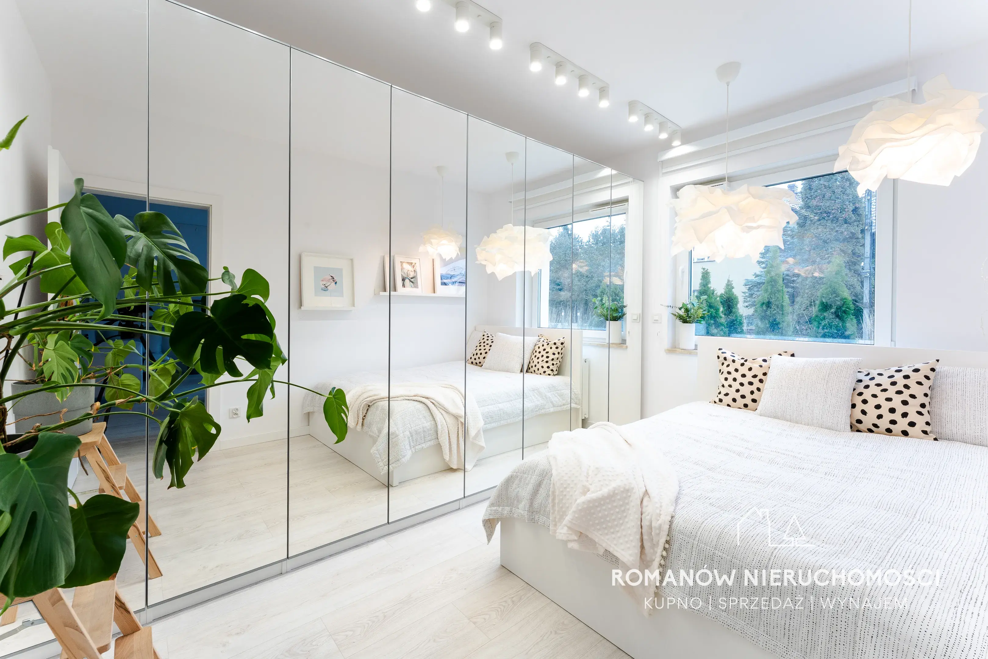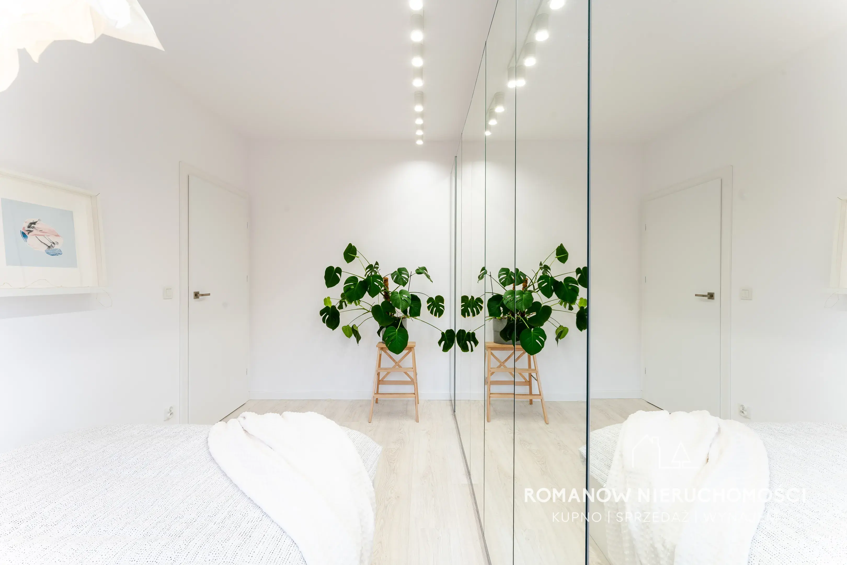 - sypialnia 11,06 m2 wyposażona w łóżko z pojemnikiem do przechowywania oraz w dużą szafę z lustrzanymi drzwiami,